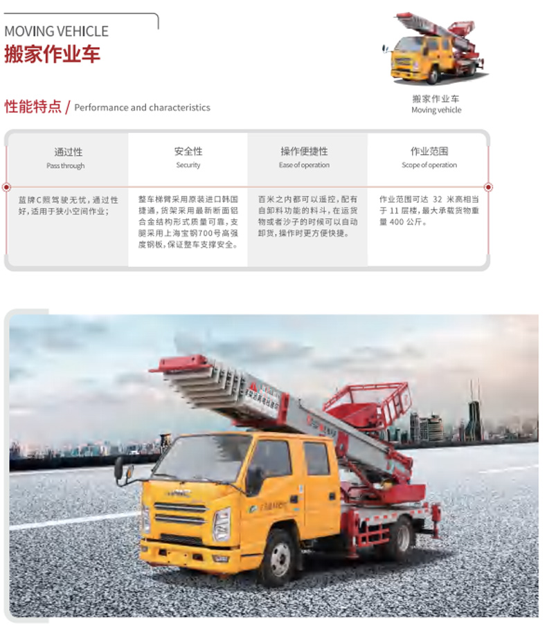 高空作業車價格_高空作業車廠家_楚勝集團★13908669111★江鈴30米搬家作業車產品名稱:楚勝牌CSC5041TBA6J30型搬家作業車,采用江鈴JX1041TSG26底盤改裝而成,該車專用裝置為云梯梯臂,主要用于搬家作業。作業范圍可達32米高相當于11層樓,最大承載貨物重量400公斤。本公司專業生產銷售各類伸縮臂高空作業車,折疊臂高空作業車,液壓升降車,搬家云梯車,外形美觀,操作方便,節省燃油。更多高空作業車盡在:www.erssigu.com
